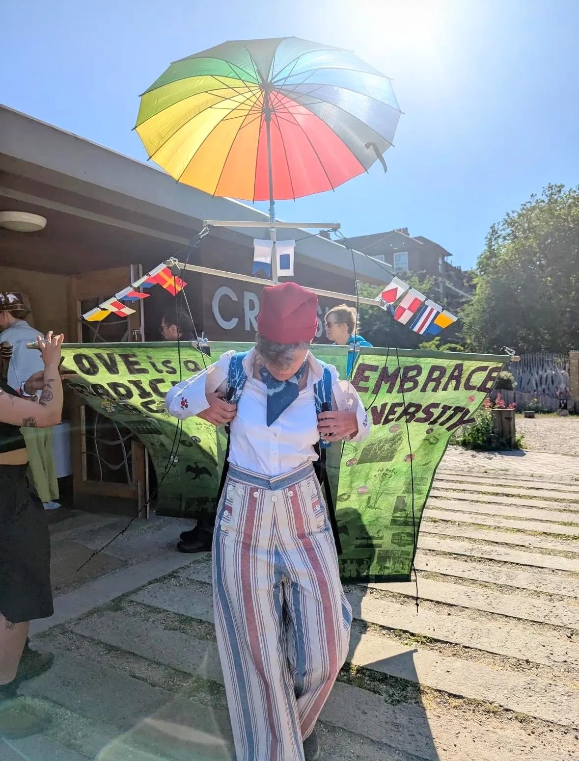 A woman walks towards us. On her backpack is a wooden frame which holds banners and flags aloft, flapping in the summer breeze. 2 green printed and embroidered banners read ‘Embrace Diversity’ above nautical flags which read: Queer As Fuck (for those that can decipher semaphore). She wears a small red hat, sailors trousers, a white shirt and blue neckerchief. At the top of the structure a large rainbow umbrella is open.